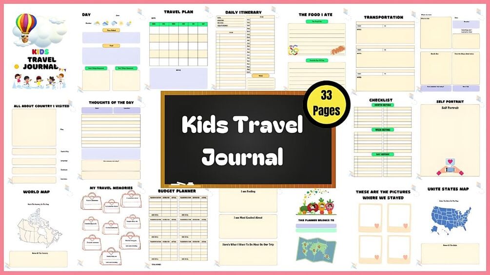 🌍 Embark on unforgettable adventures with our interactive "Kids Travel Journal," featuring 33 pages of excitement and discovery, available in PDF and PNG formats!